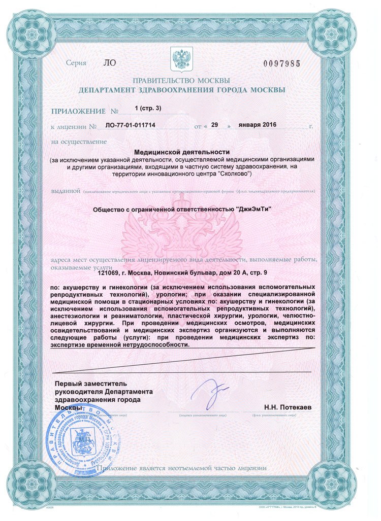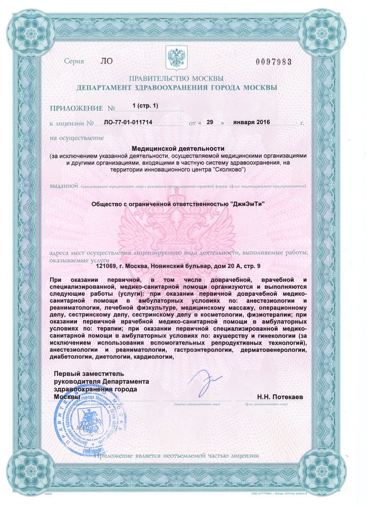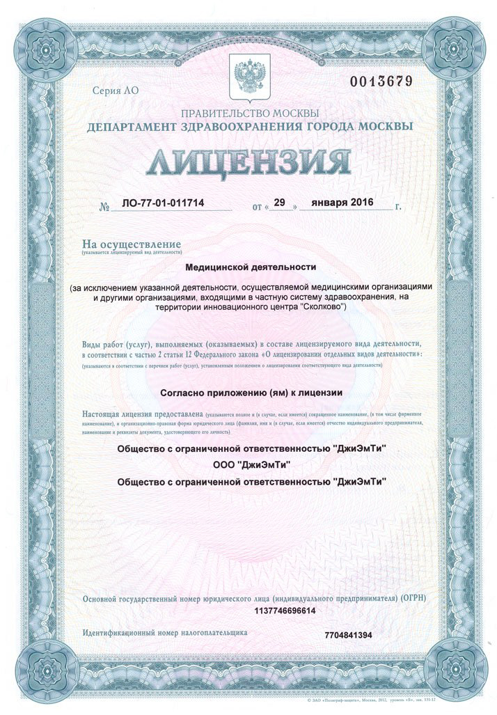 ООО «ДжиЭмТи» зарегистрировано Межрайонной инспекцией ФНС №46 по г.Москве 07.08.13 ОГРН 1137746696614, ИНН 7704841394. Лицензия на осуществление медицинской деятельности №ЛО-77-01-011714 выдана 29.01.16 Департаментом здравоохранения г.Москвы.